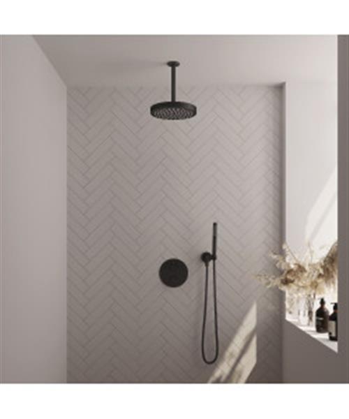 Brauer Stripe thermostatische inbouw regendouche 3-weg rond SET 39 met 25 cm douchekop en plafondarm en staaf handdouche en doucheslang en wandaansluitbocht mat zwart