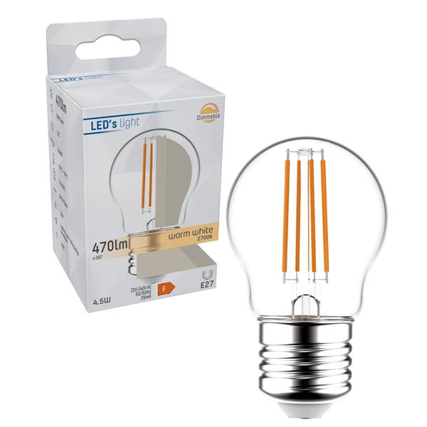 Verpakkingsinhoud:  1 x Dimbare LED Lamp Kogel G45 - Ø 4.5 cm - 4.5W (40W) -   470 lumen - E27 (grote) fitting - Warm wit licht