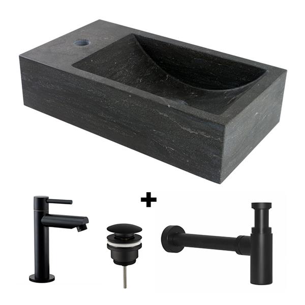 Complete set inclusief luxe mat zwarte fonteinkraan, mat zwarte afvoer sifon, waste en bevestigingsmateriaal.