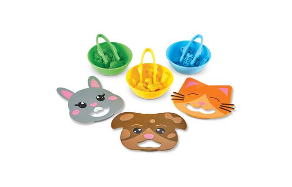 3 gekleurde kommetjes 3 huisdier deksels 3 tweezers 30 telsnoepjes in 3 verschillende vormen