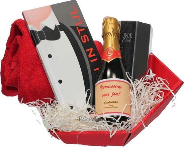 Schaal van rib karton in kleur rood met Boekje: Man in stijl, waarin leuke tips voor onze mannen die er goed uit willen zien, Badhanddoek van badstof in de kleur Rood, Eau de toilette voor Men Updo Chic 100ml., flesje Codorniu met persoonlijk etiket (de tekst kunt u opgeven) Het geheel is opgemaakt met opvulmateriaal en verpakt in folie met bijpassend lint in dezelfde kleurstelling en een zelfde klein kaartje erbij u kunt uw naam opgeven als afzender bij opmerkingen.